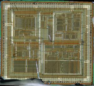 Thermal hot air with mechanical assistance (“Chips a la Antoine), 852A solder station with air and temperature set to maximum (450C). Die was damaged during removal which chipped the bottom left corner. The GEC Plessey logo was present on the chip but couldn't be imaged.